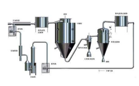 闭式循环喷雾干燥系统是在密闭的环境下工作,干燥介质为惰性气体,一般为N2,适用于有机溶剂的物料干燥有毒气的物料或干燥过程中易发生氧化的物料的干燥;该系统采用惰性气体作为循环气体,对干燥的物料具有保护作用,循环气体经历载湿、去湿的过程,介质可重复使用。