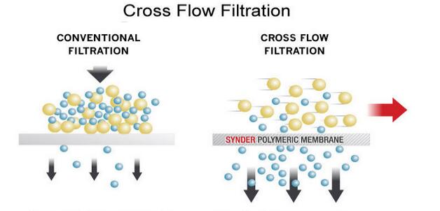 切向流过滤(TFF),也叫错流过滤(CFF),是指液体流动方向与过滤方向相垂直的过滤形式。液体流动在过滤介质表面产生剪切力,减小了滤饼层或凝胶层的堆积,从而保证了稳定的过滤速度。