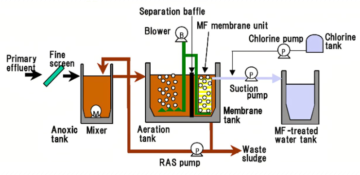 膜生物反应器是一种新型的废水处理系统,它结合了膜分离技术和生物处理技术,也称为MBR。传统的生物处理技术被终端二沉池膜组件取代,可以保持生物反应器中高活性污泥浓度,有效提高生物处理有机负荷。为了减少污水处理设施的占地面积,污泥负荷可以保持较低,从而减少剩余污泥的量。主要原理是使用膜分离设备拦截水中的活性污泥和大分子有机物。其活性淤泥浓度可达8000~10000mg/L,或更高。反应器截留效果非常明显,可有效保留长周期微生物,实现污水深度净化,增加硝化细菌增殖,除磷脱氮效果更好。