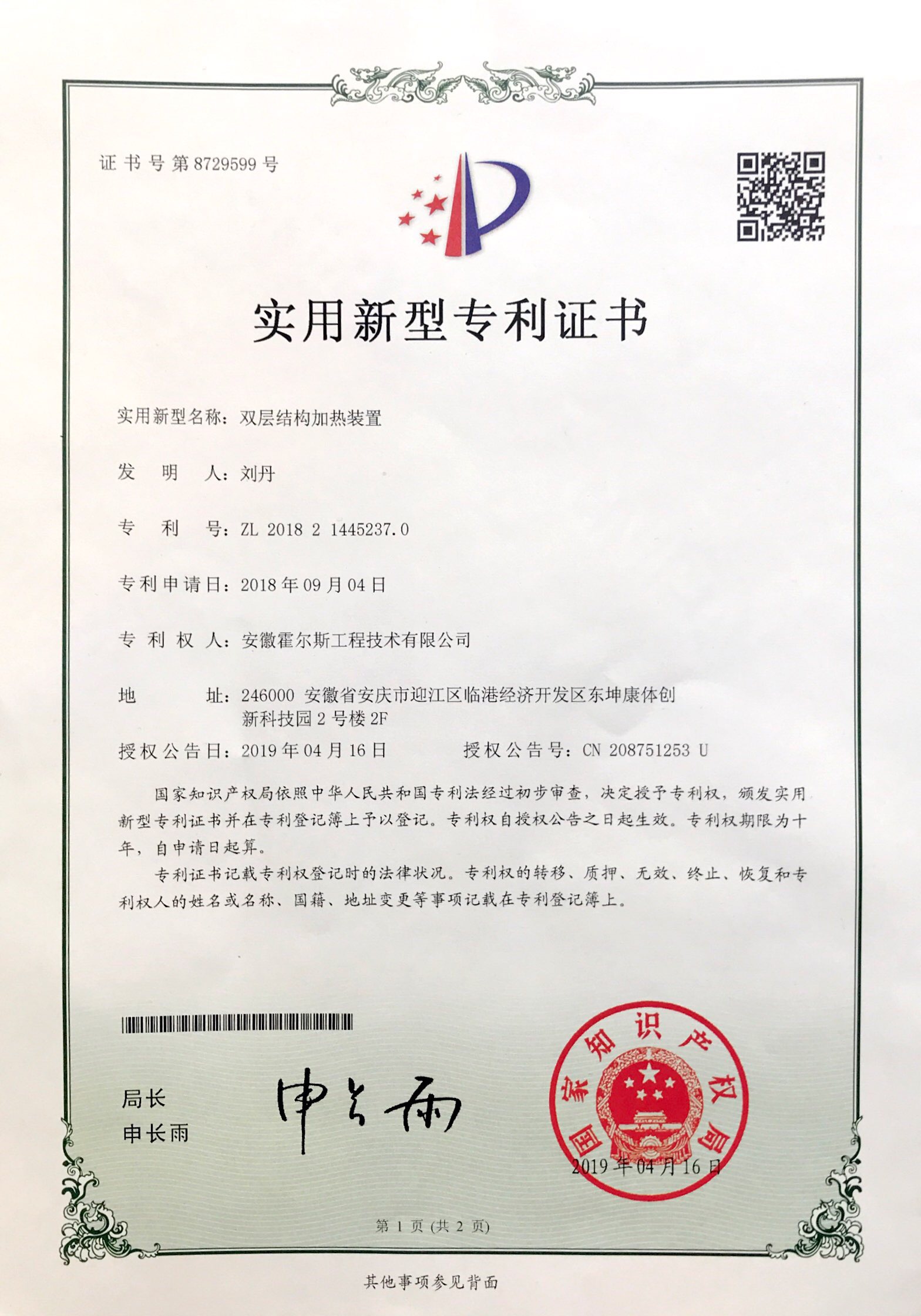 双层结构加热设计增加了空气在加热器中通过的时间,使得发热管热量更好传递给空气,保证了对空气温度的要求,发热管在发热过程中,热能有效的被加热外管和加热內管吸收,在空气通过时,提高了热接触面积,提高了热转化效率,同时有提高了能效利用率。近期,该项设计已成功获得国家专利证书,这是今年会公司坚持自主研发的又一新的成果。