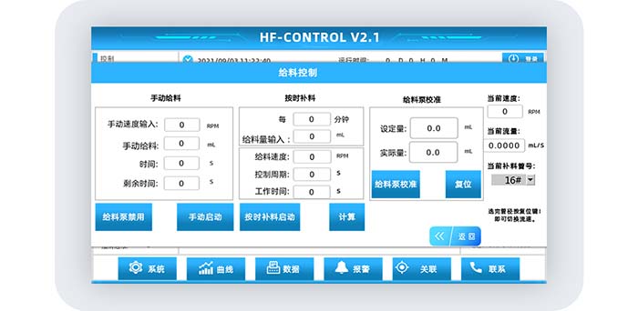设置手动补料时补料泵的转速,加入的料液体积,启动后系统可计算出定速定量后补料泵所需工作的时间,以及显示补料泵剩余的工作时间。