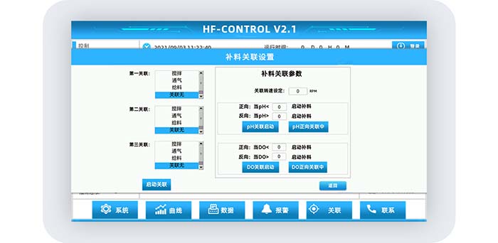 在发酵过程中,输入所需的关联转速,以及补料正向关联DO或补料反向关联DO的条件,系统即可进行补料关联DO,进行多重调节DO,满足客户多样需求。